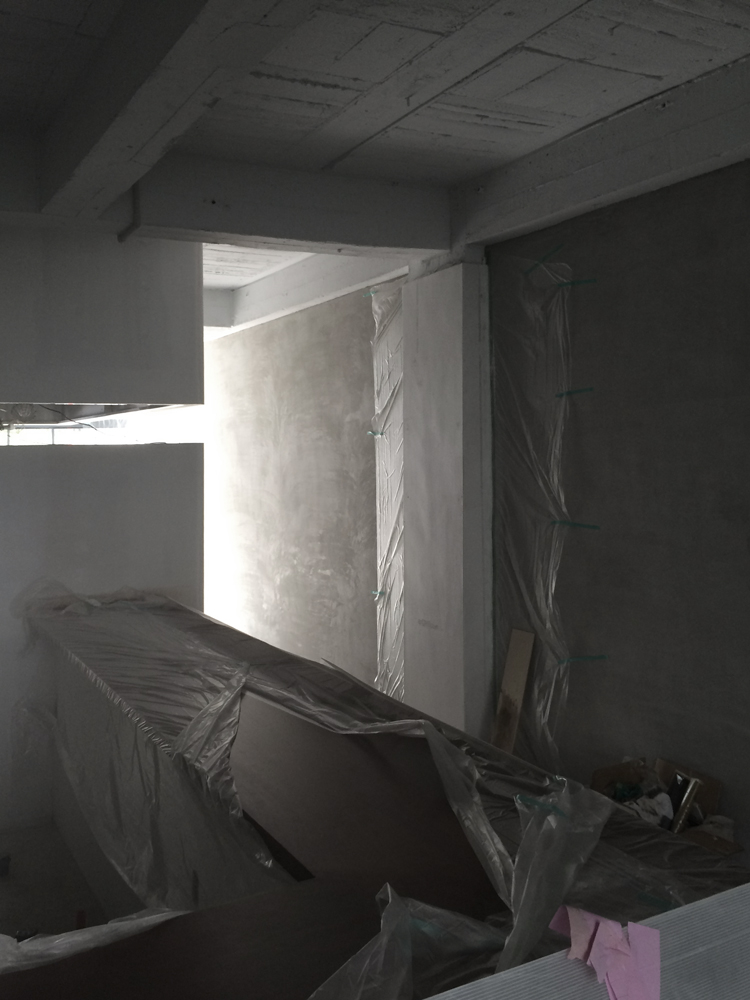 リビングと浴室を繋ぐ中庭の壁はモルタル塗りが完了した。